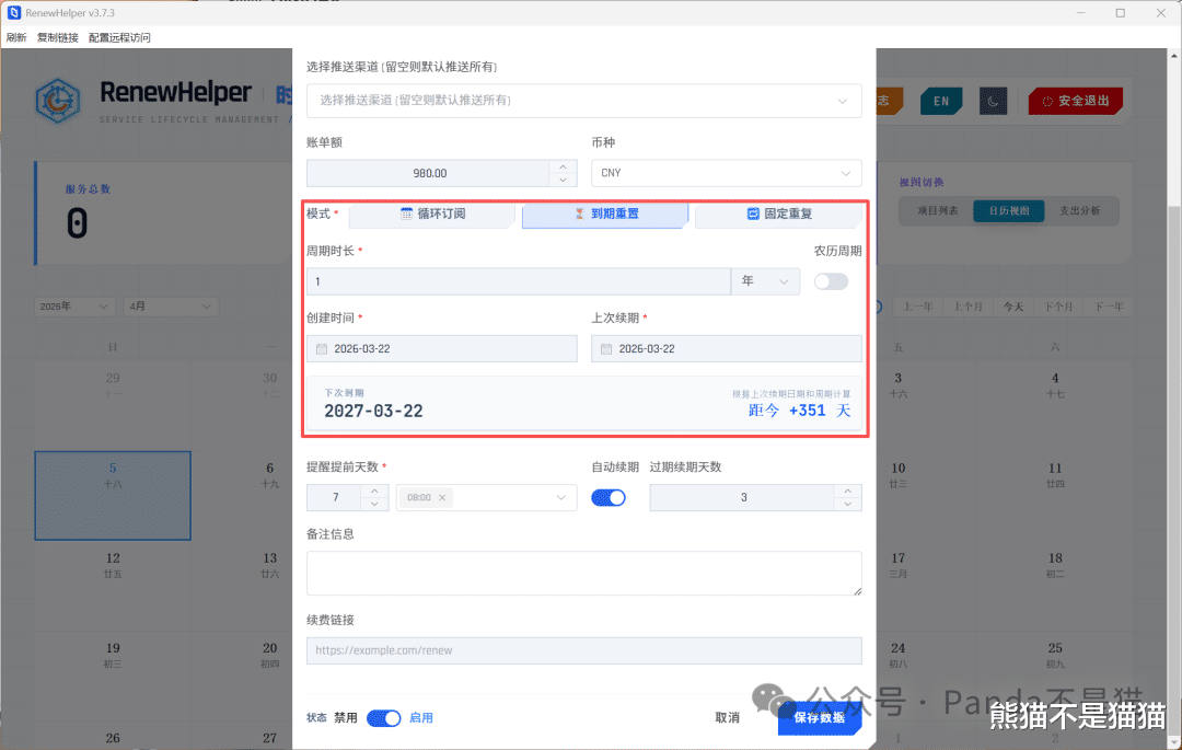 再往下能设置订阅模式,例如循环订阅、到期重置以及固定重复,在时间方面,支持日、月以及年的周期设置,同时也支持农历周期。填写好周期情况之后下方填写创建和付费时间就能自动计算下次到期和距离时间。