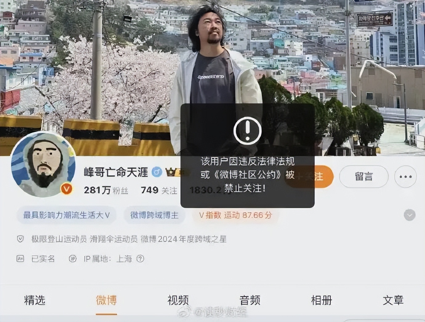11 月 14 号,有网友想找他更新的缅北探险视频,点进主页一看直接懵了 —— 微博、B 站、抖音、小红书,但凡他有账号的平台,全挂上了 “禁止关注” 的标识。要知道,这可是个粉丝加起来快 700万的大 V 啊,微博 281 万粉,B 站 255 万粉,抖音也有 130 万拥趸,说没就没,到底出了啥事儿?