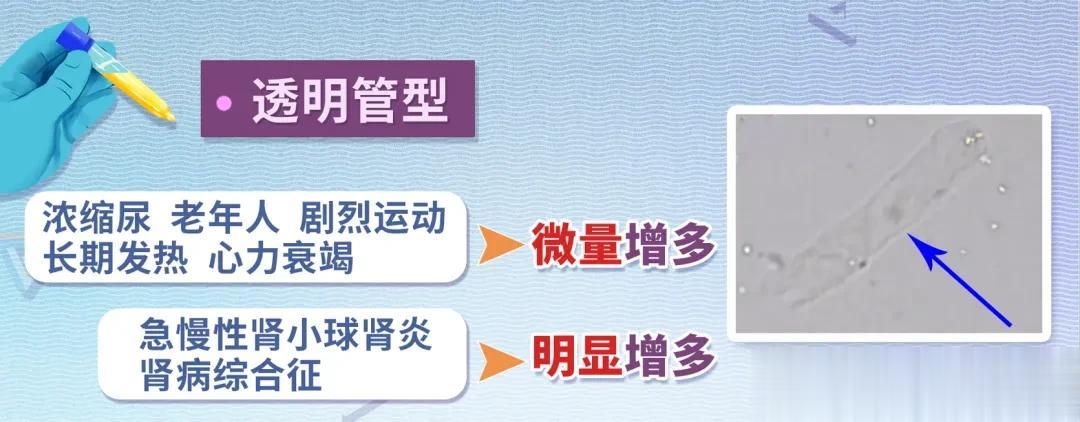 透明管型明显增多多见于急慢性肾小球肾炎、肾病综合征,微量增多老年人多见,也可能是剧烈运动、长期发热、心力衰竭。