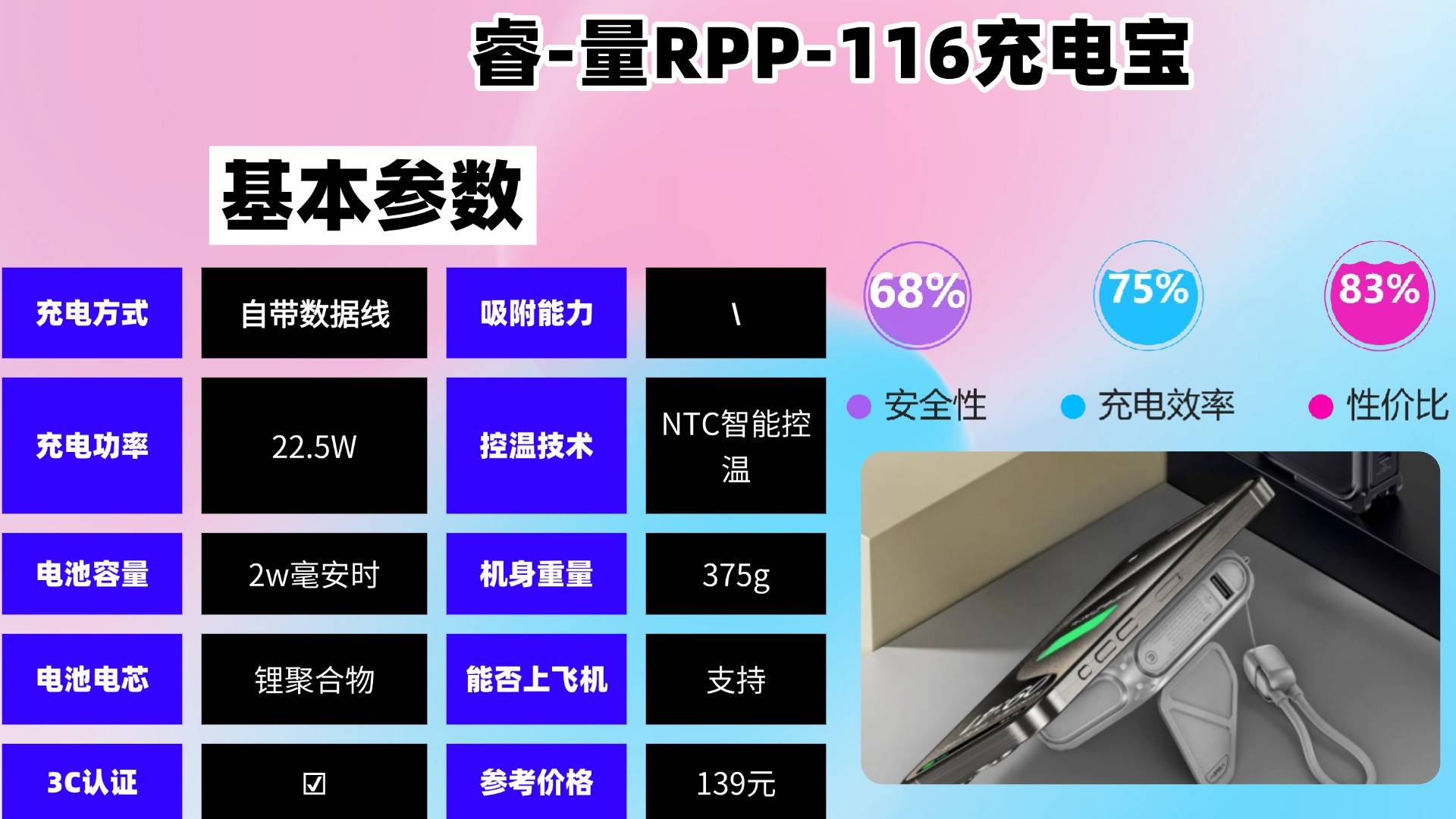 睿量RPP-116充电宝是一款设计紧凑而功能强大的便携充电器,内置10000mAh电池容量,额定容量为5300mAh,能够为手机、平板等设备提供充足的电力支持。它的尺寸为96mm x 63mm x 28mm,净重230g,体积小巧,便于携带,适合日常出行和短途旅行使用。这款充电宝最大亮点之一是配备了AC插头,可以直接插入电源插座进行充电,极大提高了充电便捷性。同时,它自带一条多功能数据线,支持三种充电方式,包括USB、Type-C和Lighting输入,满足多设备的充电需求,简化了外出时的携带和使用。支持22.5W快充,可以快速为设备充电,减少充电等待时间。此外,充电宝还具备小电流模式,适合为低功耗设备(如蓝牙耳机、智能手表等)进行充电,保护设备电池,延长使用寿命