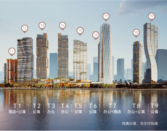 T3和T4是约280米的双子塔超甲级写字楼,T5和T7为250米高的甲级写字楼,T9为300米高的公寓楼。