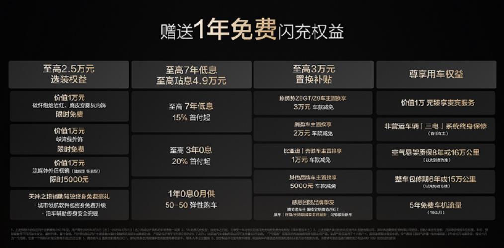 全新腾势Z9GT同时推出纯电与插混两大动力版本。其中纯电版提供闪充尊荣型、闪充旗舰型、易三方闪充性能型三款车型;插混版则包含易三方闪充尊荣型、易三方闪充旗舰型两款配置,官方指导价为26.98万元-36.98万元。新车上市权益同步开启,即刻下定即可享1年免费闪充权益,并可享至高2.5万元选装礼、至高7年低息金融方案、至高4.9万元贴息以及至高3万元置换补贴等多重礼遇。