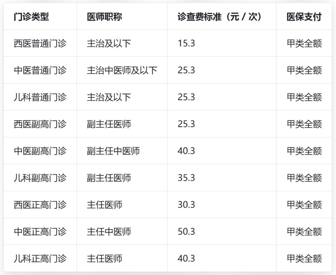 分级定价:按职称体现技术价值按医师职称、科室类型分级定价,西医、中医、儿科分类清晰,基础费用平稳且全部纳入甲类医保支付,取消双休日 / 节假日普通门诊加收(原 2 元):
