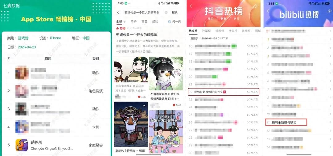 而到了4月23日,《鹅鸭杀》和《甄嬛传》联动上线,游戏当天又刷新了一波成绩:iOS畅销榜第5、抖音热搜第22、B站热搜第11、小红书单日4个同时在线热点。