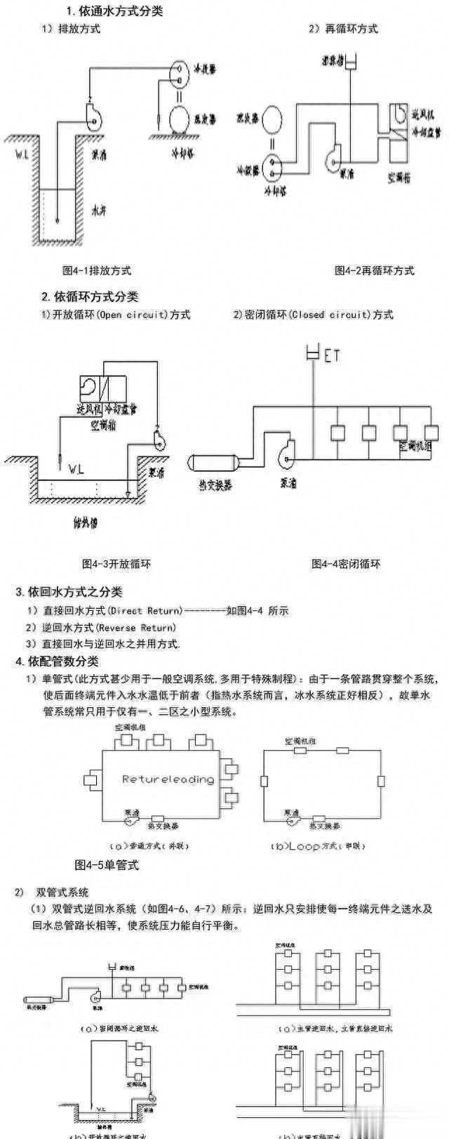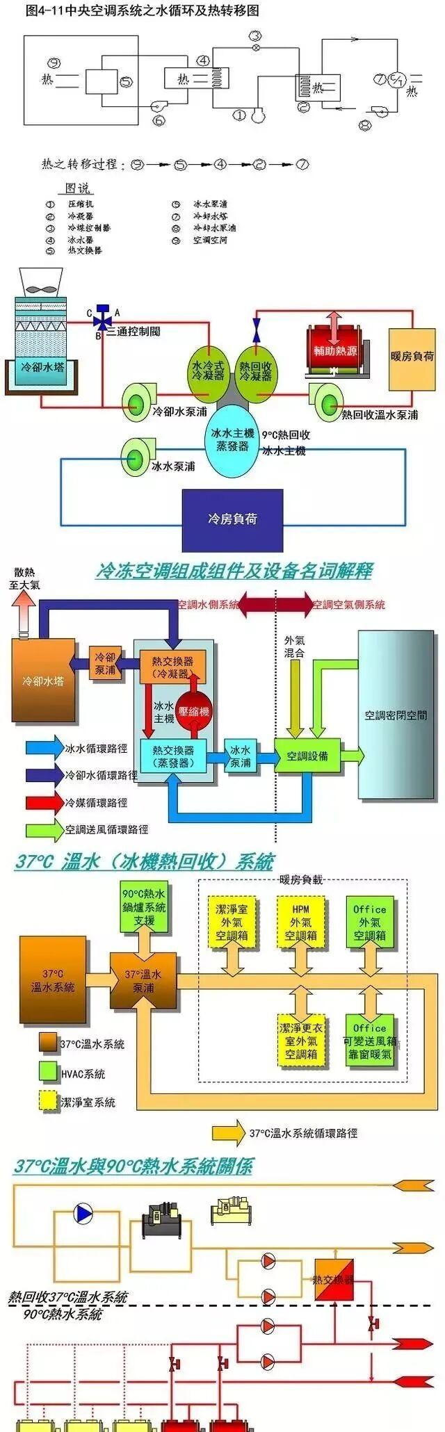 1)冰水管路:输送冰水以利在热交换器(即空气调节或小送风机)中热交换造成冷气。即使用冰水泵浦推动水到冰水主机(WATER CHILLER UNIT)之冰水器(CHILLER)制造冰水,再送到热交换器内完成热交换造成冷风,再利用风管或直接吹入空调空间,使室温达到理想条件而成冷气。