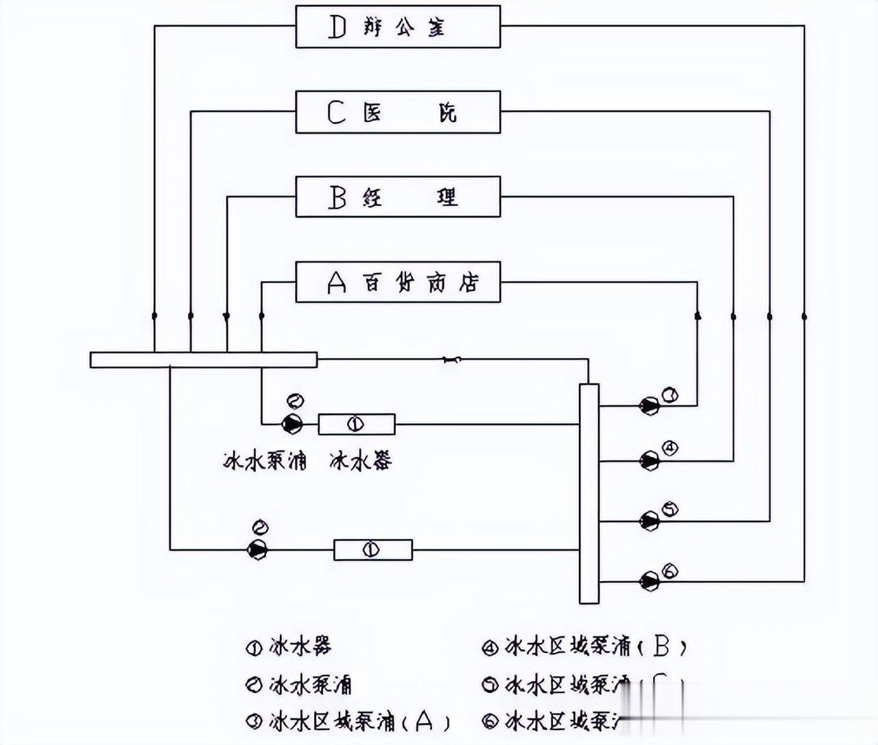 多用途建筑物为目前常见的建筑,配合业主及顾客之需要采用多角化的经营,不但建筑本体较大,而且建筑物的利用极为复杂,因此空调系统之设计必须按建筑物之用途及使用时间,利用冰水管路配合冰水泵浦加以区分为数个空调区域,再按冷气负荷的大小及空调区域的多寡来选择空调主机、冷却水塔及其他附属设备;如此可依空调区域的需要采取局部开机或全部开机。不但可收到减少冷气损失、节省可观的能源效果外,还可在空调设局部开机时,部份停用的设备获得休息及做好保养维护,而增加空调设备的寿命。(多用途建筑物冰水管路系统如图4---16所示)。