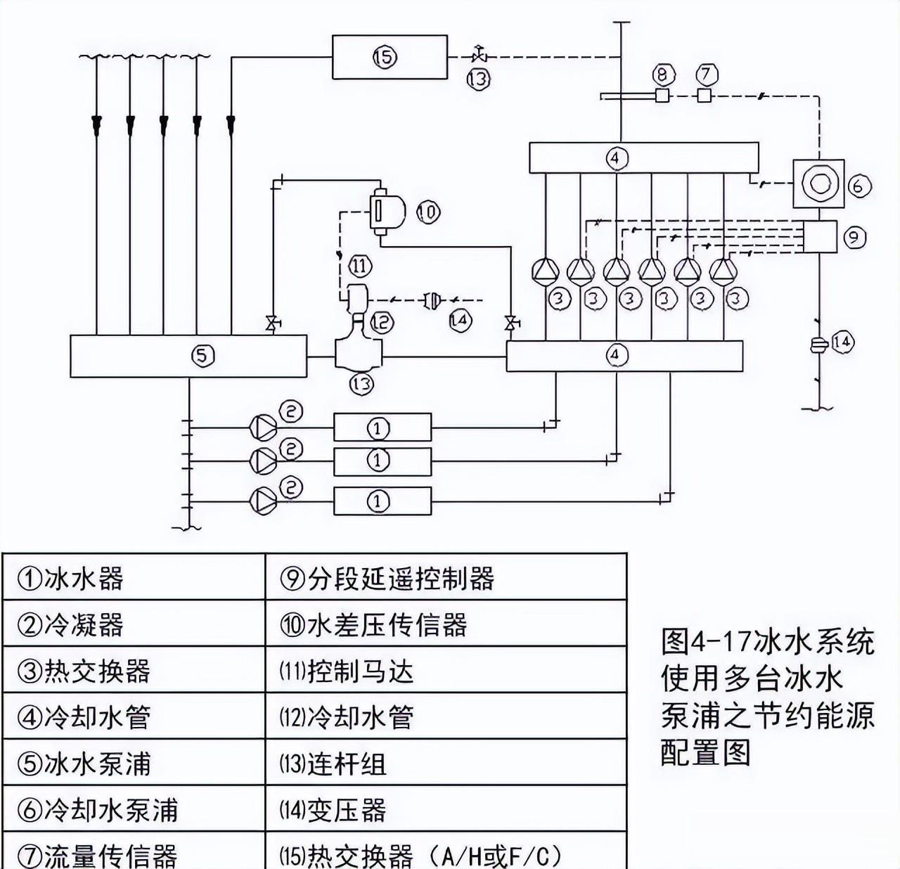 ①应用多台二次冰水泵浦之改变水量方式(此傳統方式目前較少採用,如图4—17所示)。