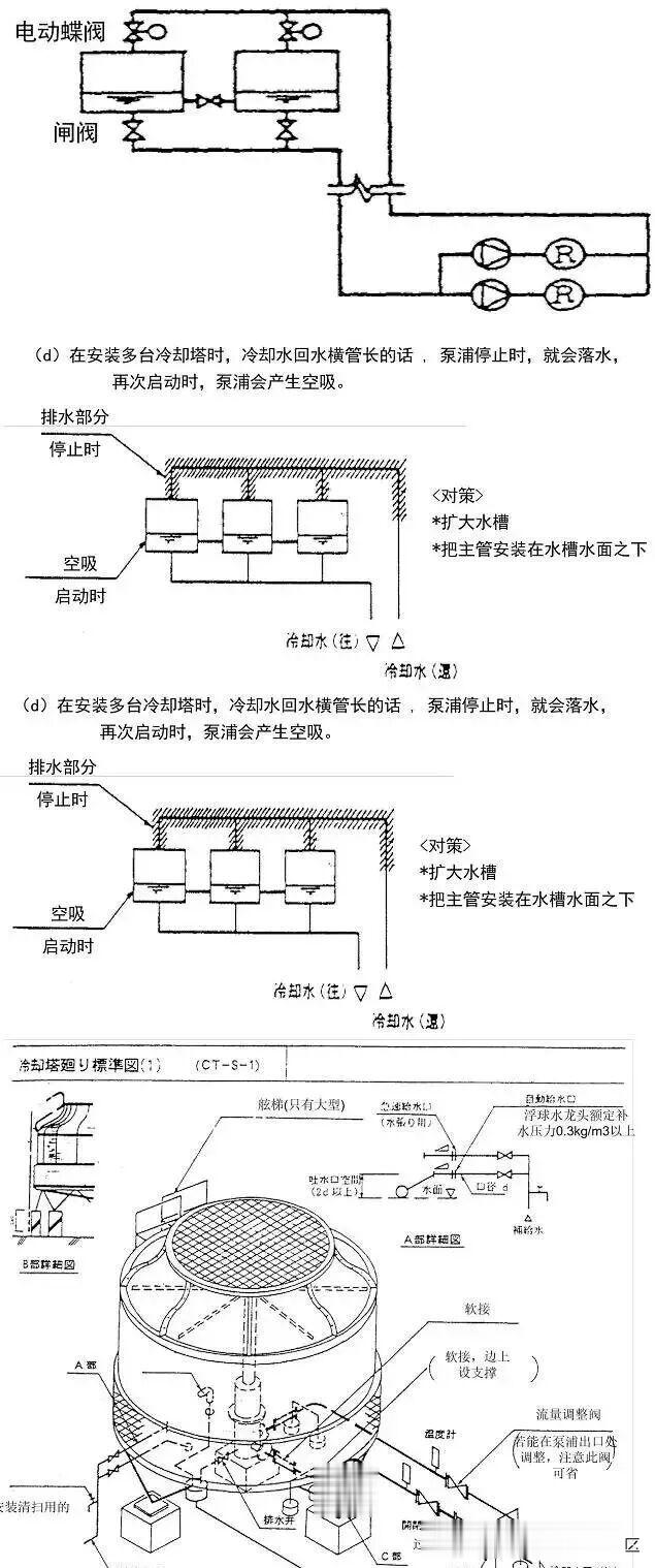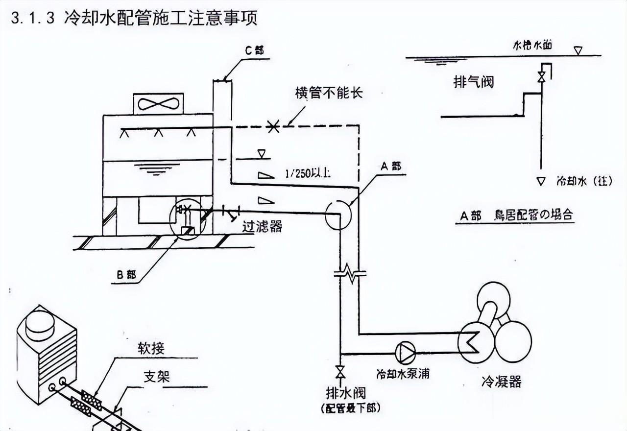 1)冷却水管配管应向冷却塔倾斜,但是在鸟居配管场合,应设自动或手动排气阀。