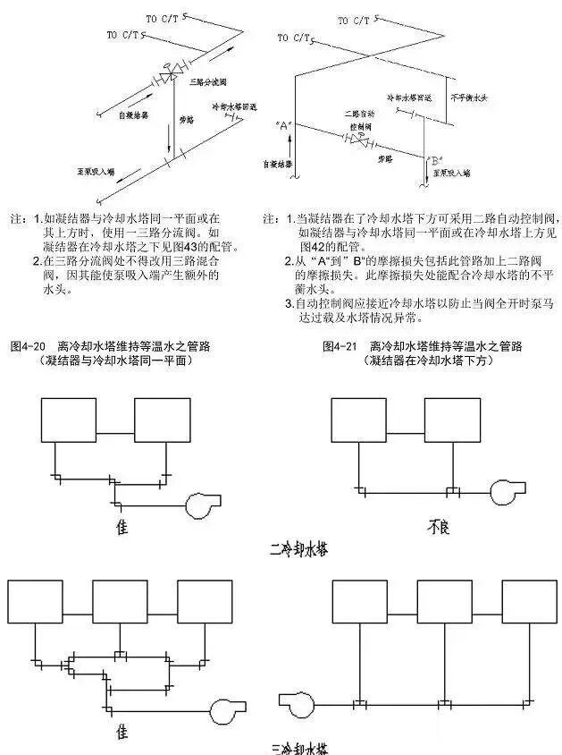 图4-22为冷却水塔配管的典型事例。均压(連通)管可用为使每座冷却水塔内的水位等高。