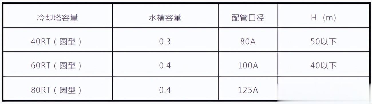 冷却塔的水槽容纳水量 > 立管(图中H)部分的存有水量(参照下表)