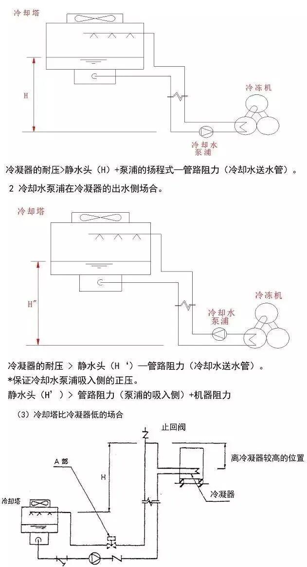 (2)冷却塔在冷凝器上方的场合:检查管路的压力分布,不能超过冷凝器的耐压上线。