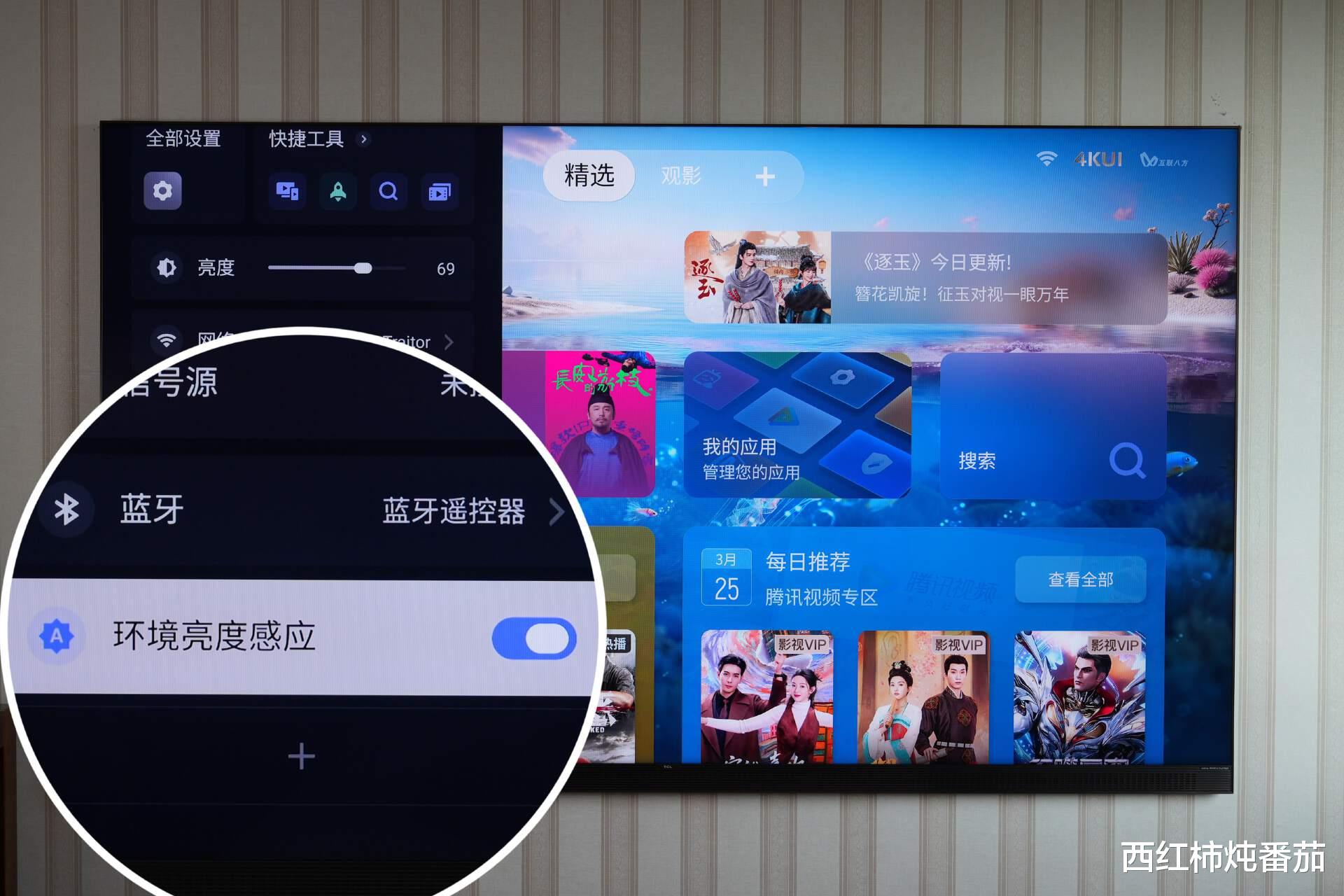 在设置中有一个叫做「环境亮度感应」的开关,将其打开后电视屏幕就会跟手机屏幕一样自动检测环境亮度并调节至最佳状态,确保用户用眼舒适 ▲