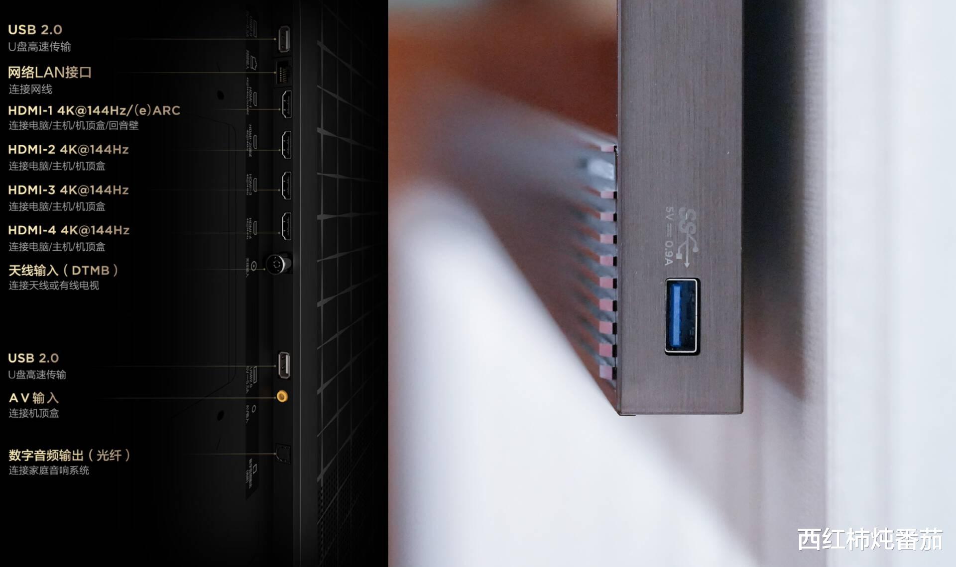 接口方面包含4个满血版 HDMI2.1接口,支持4K@144Hz输入,可以同时外接 Switch、PlayStation等游戏主机,,其中 1号HDMI还支持 eARC,方便连接回音壁输出。