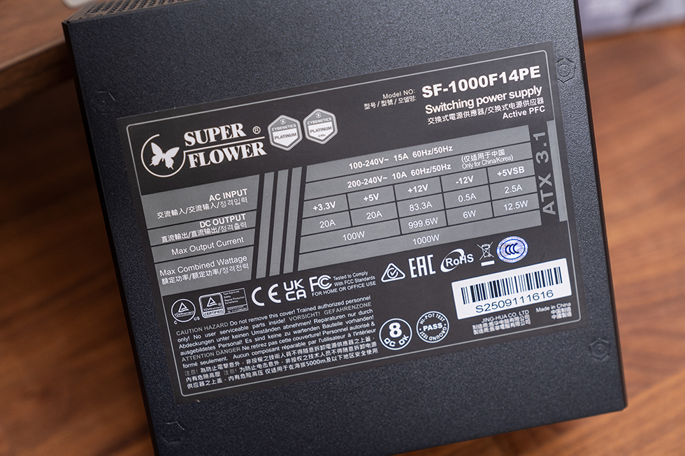 振华 LEADEX III PE 1000W电源的额定功率为1000W,采用单路+12V输出设计,其中+12V输出电流为额定83.3A,相当于功率999.6W,可满足大部分当代PC平台的用电需求;+5V和+3.3V的额定电流为20A,联合输出功率为100W;+5V待机与-12V的额定电流则分别为2.5A与0.5A,基本满足多数平台的使用需求。