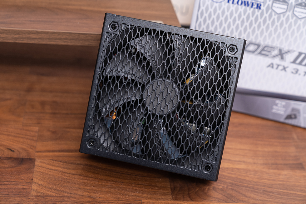 电源尾部设计了密集的蜂窝状散热孔,配合内部的双层立式变压器(振华自研,体积更小、散热效率更高)与大面积散热片,形成 “从底部进风→内部元件散热→顶部风扇出风” 的完整风道。即便在 CPU 与显卡双烤的满负载场景下,也能快速排出内部热量,避免元件因高温老化。