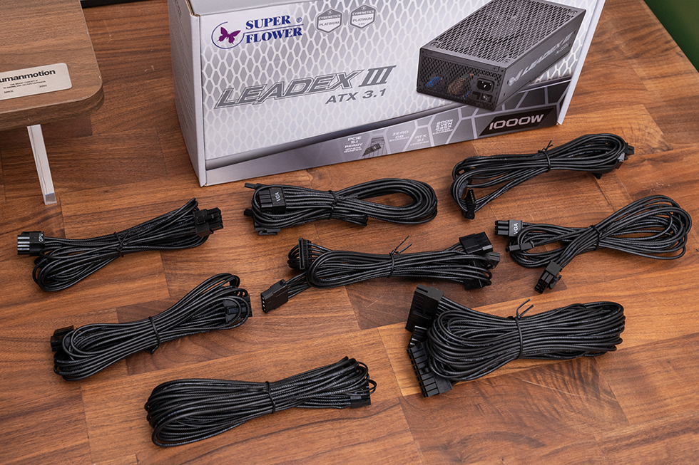 振华 LEADEX III PE 1000W电源的模组接口并没有采用振华以往常用用的九宫格通用设计,而是使用当前主流的8pin与6pin模组接口,其中有8个8pin接口可用于扩展CPU与显卡供电接口,有4个6pin则用于扩展SATA供电以及D型4pin供电。配备符合 PCle 5.1 规范的原生 12V-2x6 接口,可负荷300%的瞬时峰值功耗,满足最高600W的旗舰显卡供电需求。