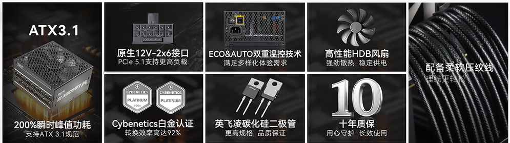 振华 LEADEX III PE 1000W电源符合ATX 3.1与PCIe 5.1规范,可承载200%的整机瞬时功耗与300%的显卡瞬时峰值功耗,能为高性能主机提供稳定持续的电力支持。通过了Cybenetics千余项严苛测试,在230V的静态负载下,其平均转换效率可以达到92%,获得了Cybenetics白金牌认证,高效节能。