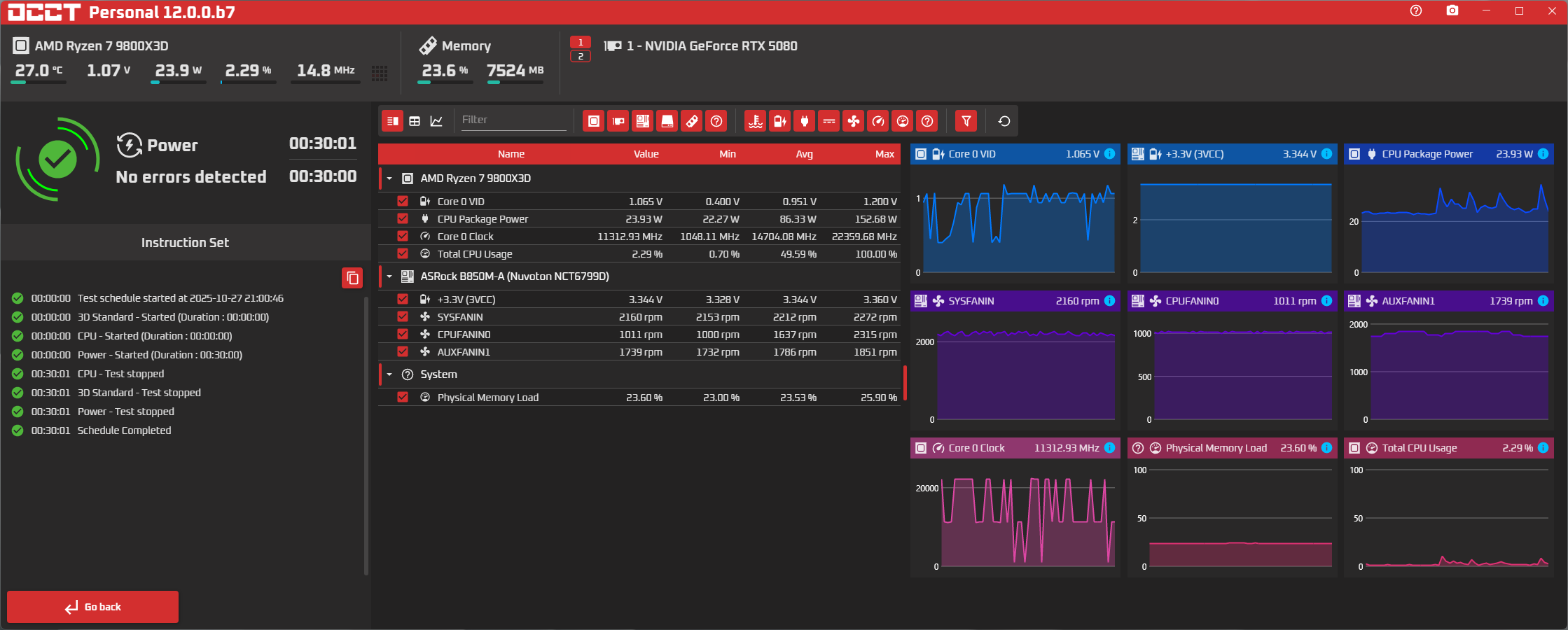 通过OCCT对电源的整体稳定性进行测试,30分钟POWER TEST无任何报错情况,电压波动稳定,系统运行正常。