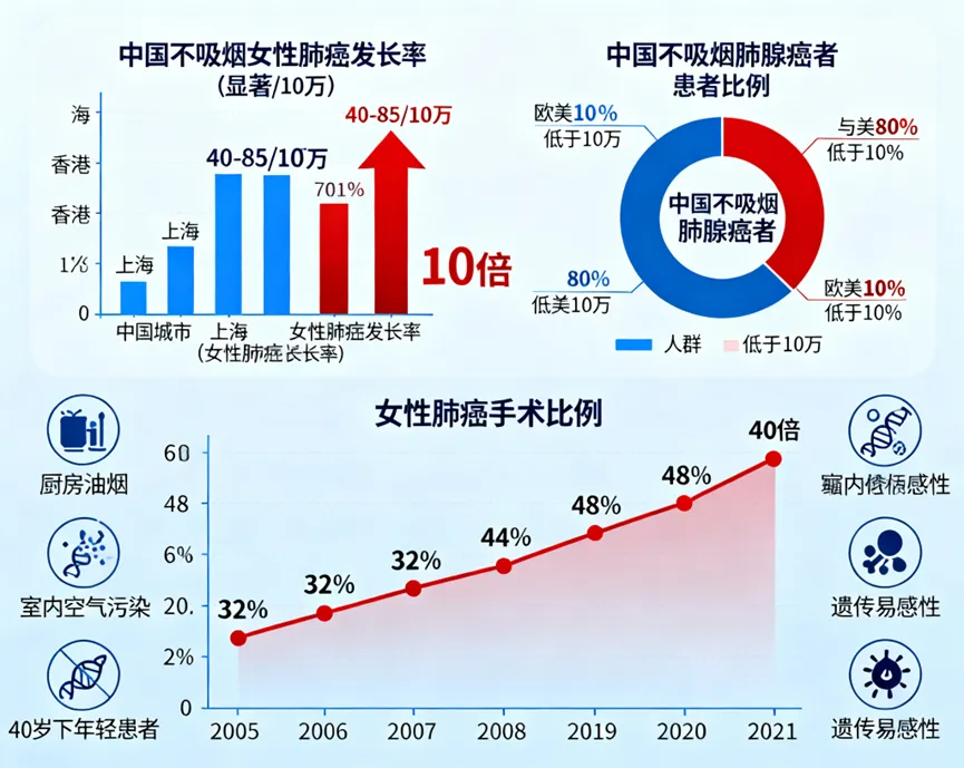 不吸烟女性肺癌发病率显著上升,中国尤为突出近年来,全球肺癌流行病学呈现出一个显著趋势:不吸烟人群的发病率持续上升,其中中国不吸烟女性肺癌的快速增长尤为引人关注。多项研究证实,中国不吸烟女性肺癌发病率显著高于欧美地区,且年轻女性逐渐成为新的高风险群体1。数据显示,上海、香港、天津等城市女性肺癌发病率高达40–85/10万,远高于欧洲和非洲地区的水平(通常低于10/10万),其差距可达10倍以上2。尤为值得注意的是,欧美国家不吸烟肺腺癌患者比例通常低于10%,而中国部分地区这一比例超过80%,凸显出独特的地区性差异3。