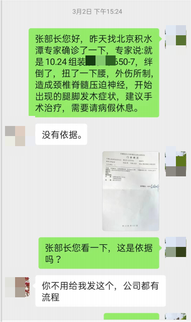 3月2日,他通过短信向公司人事负责人提交病历、休假证明,申请病假治疗,公司却称“没有依据”,直接回复“批不了”,仅含糊告知“走公司流程”,却不说明具体流程、对接人、审批路径。李某宝因病情紧急、下肢麻木无法正常上班,只能先行就医治疗。