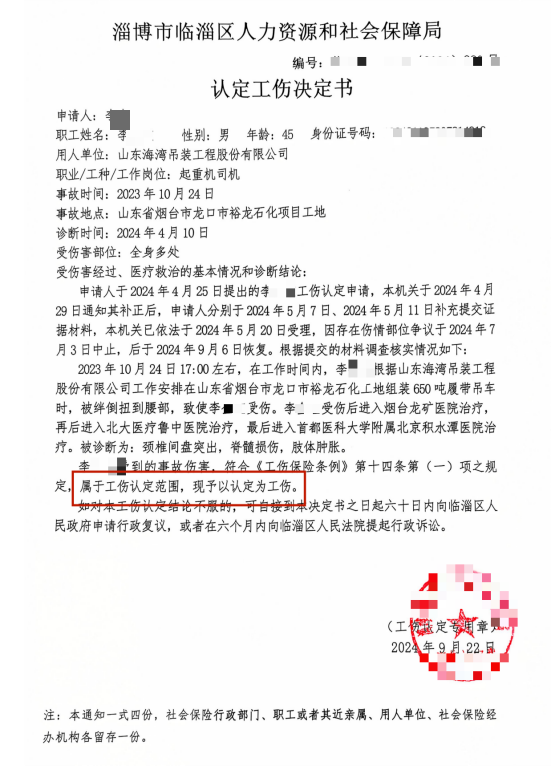 与此同时,山东海湾吊装公司起诉撤销工伤认定,临淄区法院一审判决撤销工伤认定,李某宝上诉后,淄博市法院终审判决撤销一审判决、维持工伤认定,明确其受伤属于工伤。