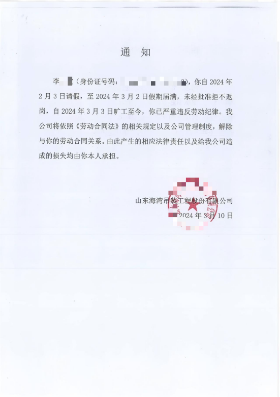 2024年3月10日,山东海湾吊装公司在李某宝法定医疗期、工伤治疗期内,以“连续旷工超过7天、严重违反规章制度”为由,单方解除劳动合同。