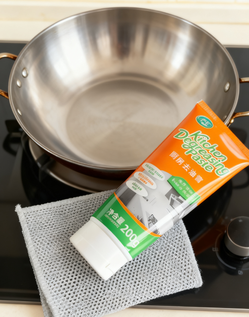 现在我都用一品净去油膏厚涂一层,等十分钟后用百洁布轻轻一擦,锅底黑圈就像橡皮擦一样消失,锅还亮堂堂,省力又护锅。