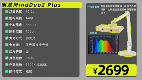 小学生用护眼灯什么样的好?明基MindDuo2Plus护眼台灯主体采用PC树脂与铝合金材质,边角圆润处理,安全性比较高,适合有儿童的家庭使用。色温调节范围为3300K至5300K,可适配不同场景的用光需求,搭配自动调光功能,能根据环境亮度动态调整光线强度。灯臂支持多角度调节,照明范围较广且光线分布均匀,底座稳定性较好。不过,实测显示其蓝光峰值接近1.0,长时间使用可能加剧视觉疲劳,而且功能集成度较高导致操作界面稍显复杂,对幼龄儿童和老年用户来说不够友好。