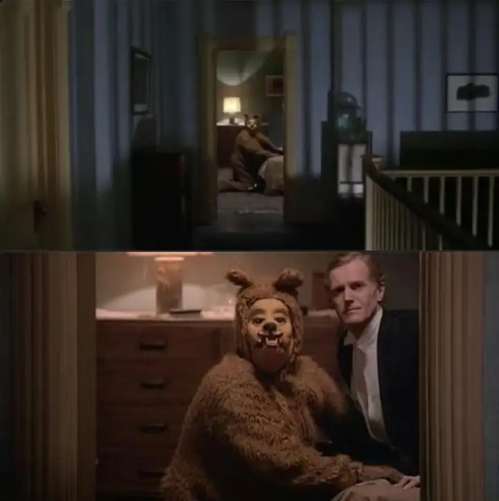 另一个是影片后段温蒂在远望酒店里四处寻找丹尼时,在一个房间里看到了“熊猪福瑞”和别人进行不可描述之事的镜头,同样是被裁切到了只剩一个头,看着有些莫名其妙——当然,这一幕本身就有些“莫名其妙”,只是变得更抽象了。