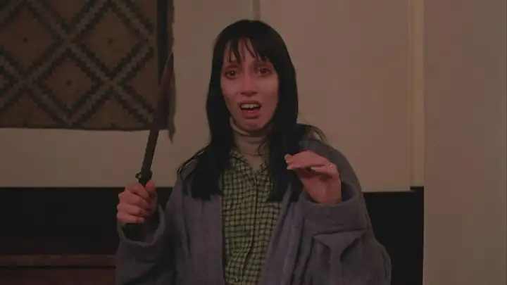 原来许多人说“《闪灵》里最吓人的其实是女主温蒂”,我还不觉得有多准确,可这次一看,好家伙,修长的身材、“暴露”的眼口、惊惶的神态、贴身的长衣、手中的尖刀,分明是与远望酒店相映成趣的高配。