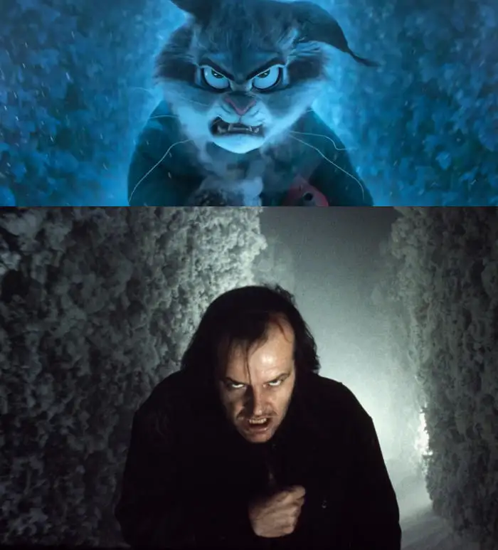 有意思的是,昨天《闪灵》在内地上映的首日,单日票房冠军仍是上映了将近两个半月的《疯狂动物城2》(我在进场前还特意去隔壁厅瞄了一眼《疯动2》)——有无数观众在这部动画电影里看到了致敬杰克、致敬《闪灵》的镜头画面。