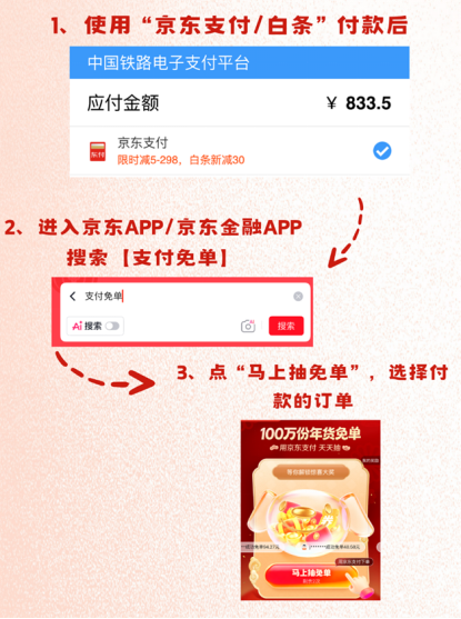 即日起,在 12306 APP 购票时,选择京东支付、白条,每日可享双重惊喜。首先是立减优惠,用京东支付、白条购买车票,随机享优惠,单笔最高可省 298 元;支付完订单后,来京东 App 搜 “支付免单”,选择付款的车票订单,即有机会享免单,参与 “十万份车票免单天天抽”。