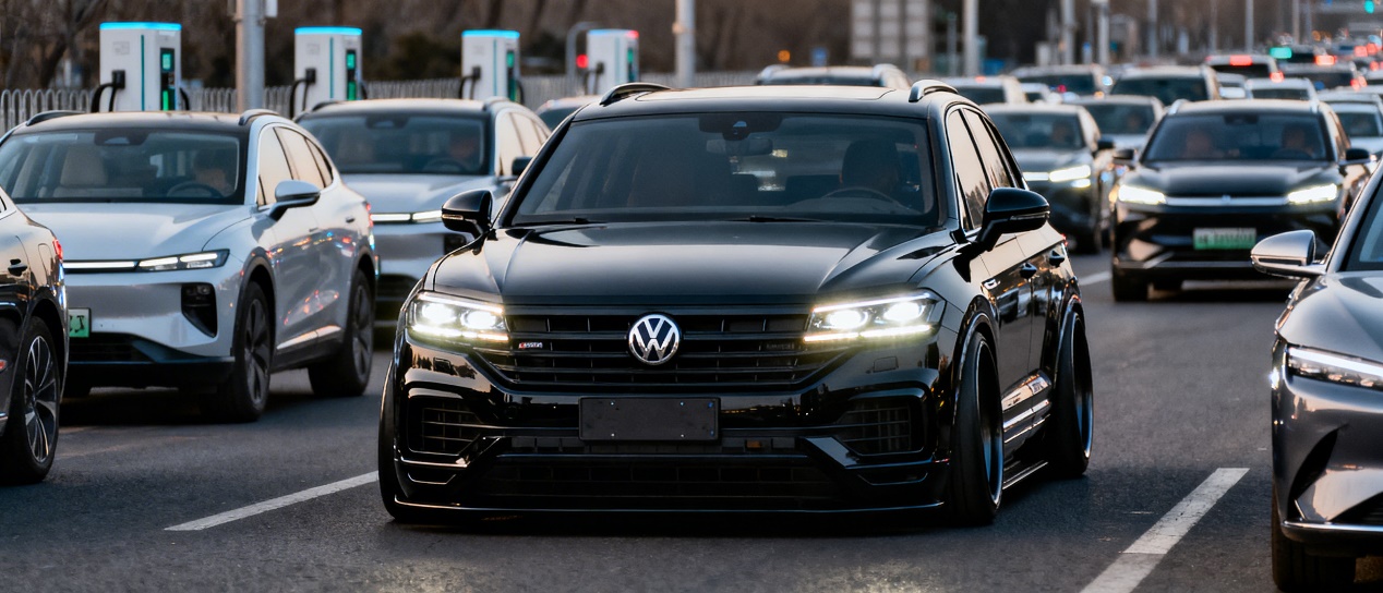 2026年的北京早高峰,东三环的车流里塞满了各色纯电SUV,电机的啸叫混着充电桩的广告声,突然一阵低沉的V6轰鸣从旁边窜出——一辆熏黑的途锐锐臻版,矩阵大灯扫过车流,车身姿态低趴又霸气。这场景够魔幻:在新能源渗透率破60%的年份,大众居然掏出了75.58万的燃油旗舰,还带着EA839 V6和托森差速器,这是跟时代对着干?