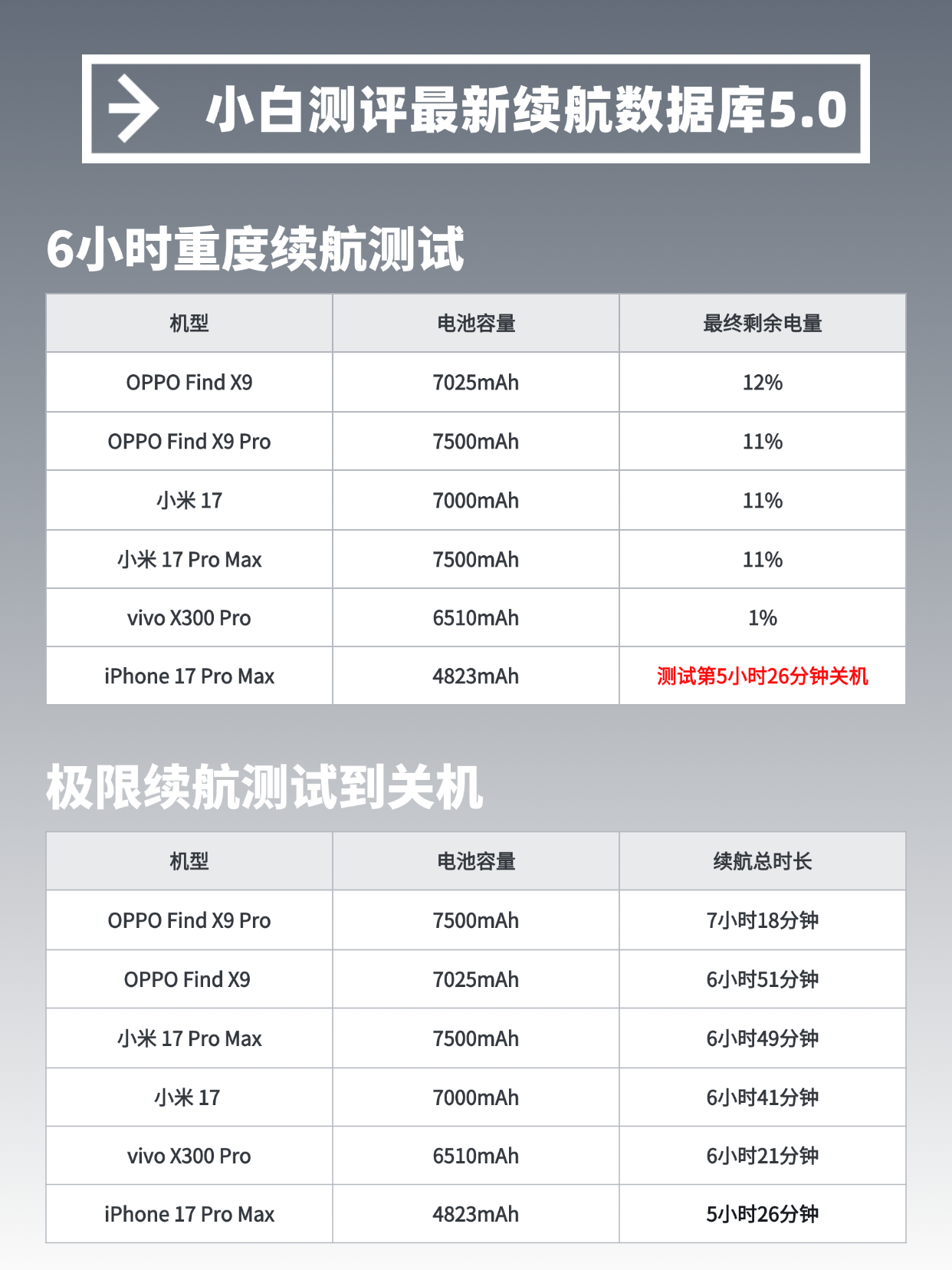 当然了,只是电池大还不够,优化也得到位才行。这部分推荐看看小白测评最新公布的续航数据库5.0中,在六小时重度续航测试中,拥有7025mAh的OPPO Find X9还能剩12%,配备7500mAh的OPPO Find X9 Pro、小米 17 Pro Max都剩余11%;只有6510mAh的vivo X300 Pro则只剩下1%了,4823mAh的iPhone 17 Pro Max更是在测试的第5小时26分钟提前关机了,手里头没充电宝的话,续航焦虑党看到这已经开始慌了。而在极限续航测试到关机中,7500mAh的OPPO Find X9 Pro更坚持了7小时18分钟,直接拿下榜单第一,OPPO Find X9坚持了6小时51分钟拿下第二,然后是6小时49分钟的小米17 Pro Max、6小时41分钟的小米17、6小时21分钟的vivo X300 Pro,以及5小时26分钟的iPhone 17 Pro Max,这数据罗列下来差距挺直观的。