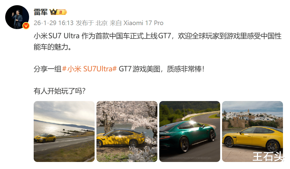 就像雷总自己说的,小米SU7 Ultra是作为首款中国车正式上线GT7,能让全球玩家充分体验到中国汽车的实力和魅力。