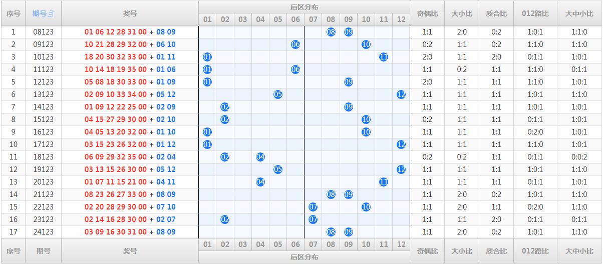 七、历史同期,后区开奖结果和走势图(历史数据演示):