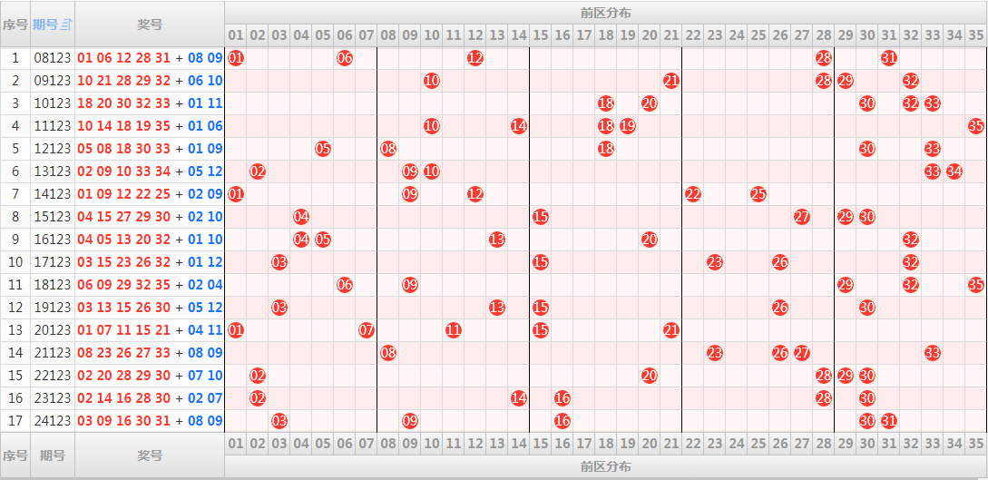 六、历史同期,前区开奖结果和走势图(历史数据演示):