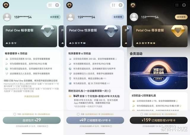 我在搭载鸿蒙5.1的nova 14 Pro上,找到了这些难题的终极答案:Petal One会员。它不是单个App的会员,而是一个鸿蒙系统应用的“会员全家桶”服务,一个套餐包含了华为云空间、视频、音乐、阅读、主题、运动健康等多项权益。同时,它提供畅享、悦享、尊享三种套餐,分别是29元、49、159元包月。大家可以根据自身的需求选择,现在新用户订阅悦享或尊享套餐,除了1个月权益外,还额外赠送影视VIP年卡礼包。