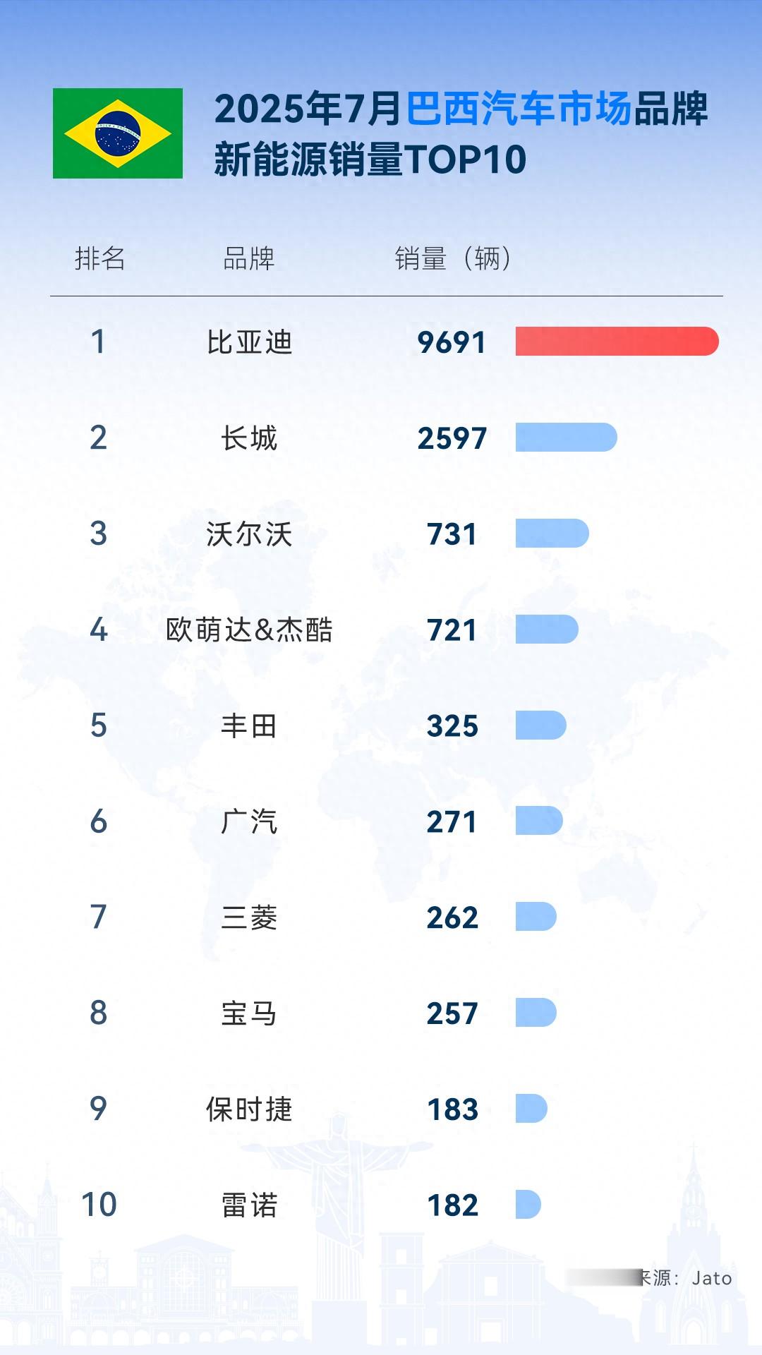 在巴西,比亚迪7月单月销量9691辆,同比大增60%,成功跻身品牌榜前十,并且稳居新能源销量榜第一。其中,海鸥售出3011辆,同比激增102.4%;宋PLUS销量1825辆,成为第二大畅销车型。比亚迪凭借丰富的产品矩阵,实现了纯电与插混的全覆盖,精准满足了不同消费群体的需求。