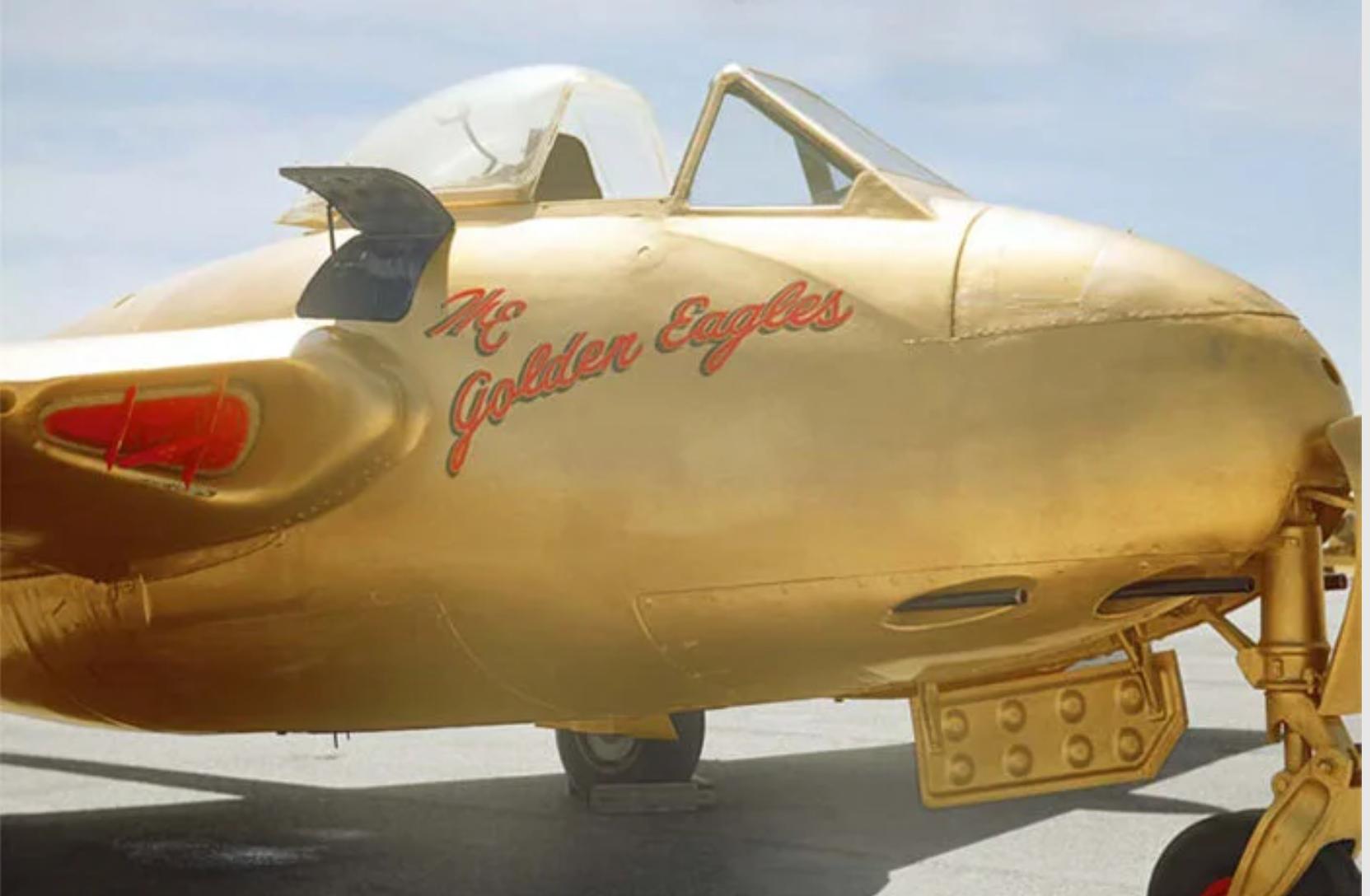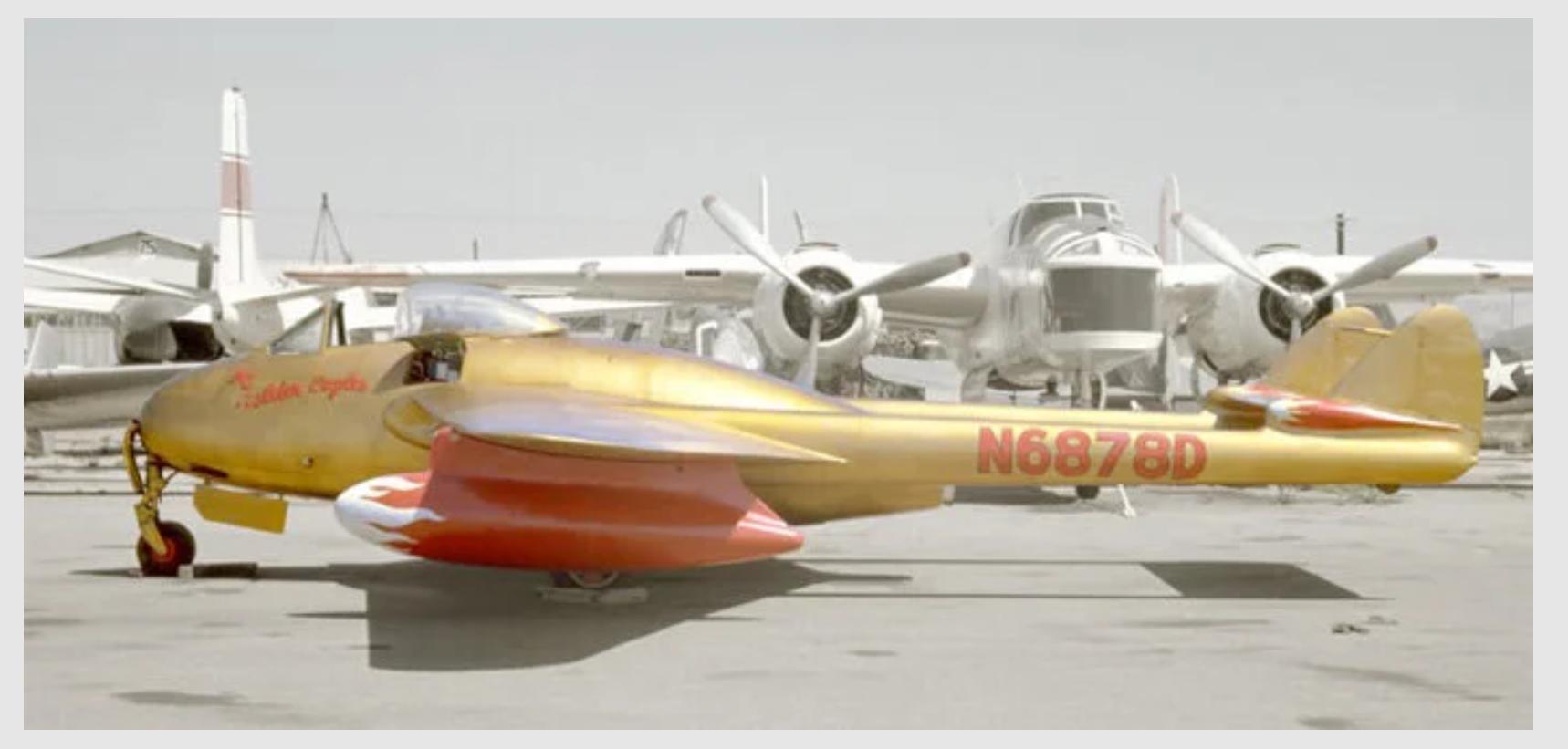 约翰购买了加拿大皇家空军退役的编号17038“吸血鬼”战斗机,并命名为“ 金色吸血鬼”(民用编号N6876D),涂装成耀眼的金色车头写有 “约翰尼·天火箭 ”字样。约翰在表演时会穿上带斗篷的蓝色缎面飞行服,胸前有一个金色大“J”,头盔和靴子是银色的。不过约翰的飞行表演生涯很快就不光彩的结束了,他陆续卷入了鲁莽飞行(跑道上有人强行降落受损)、虚假广告欺诈(售出取消的表演门票)、开空头支票(用来付喜来登酒店13.85美元房费)被捕并起诉,所以您现在知道为什么他要改名换姓了。