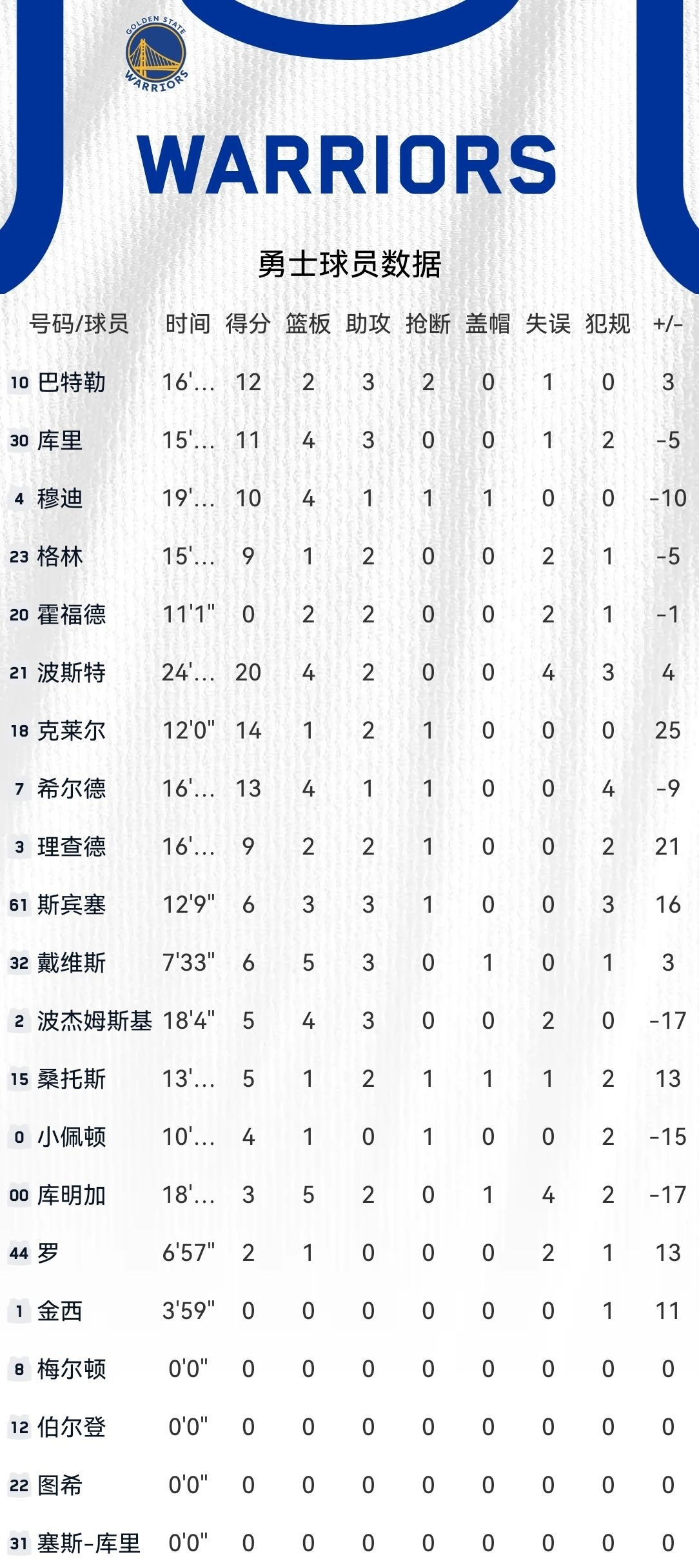 二是本场得分点多点开花:在这场比赛中,勇士队展现出了均衡的进攻火力,全队共有4人得分上双。除了波斯特的20分之外,希尔德贡献13分,巴特勒拿下12分,穆迪也有10分入账。