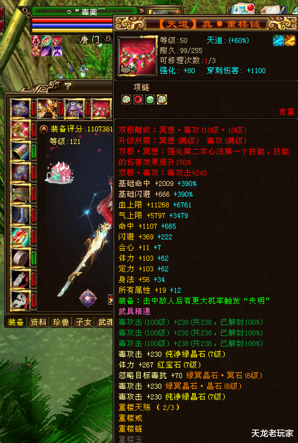 【天龙】服务器的冷傲火武当身上也有一条,剩下的真重楼链分属【水晶湖】服务器,最初是花落沾身的,后来转到了二进阶恶人谷身上,现在恶人谷易主给窦哈哈,真重楼链不知所踪。