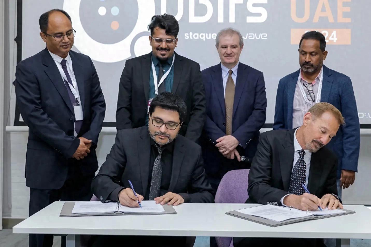 头图左座为 SuperQ 首席执行官 Muhammad Khan 博士,右座为 D-Wave 首席执行官 Alan Baratz 博士,图为双方在 Qubits UAE 上签署合作协议。