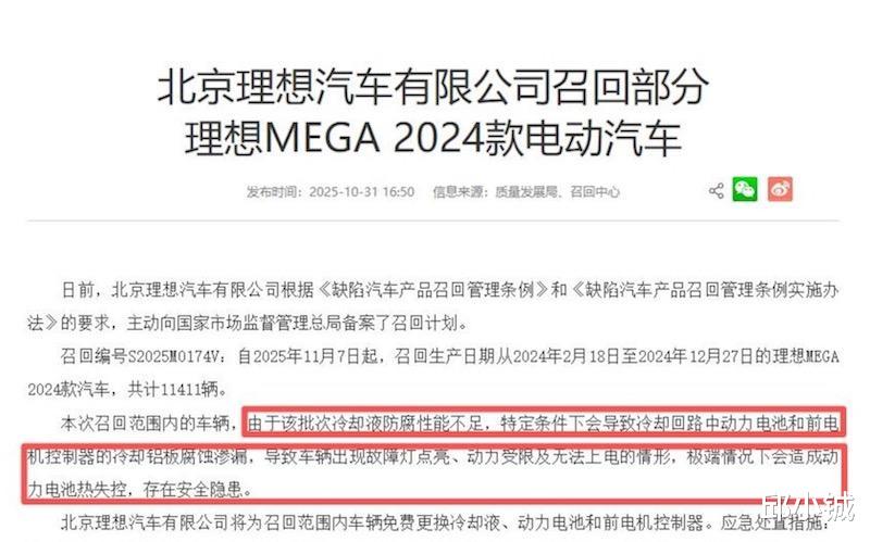 10月的最后一天,理想汽车发布召回公告,对2024年2月18日至2024年12月27日期间生产的1.1万余台MEGA进行召回,召回措施为安全检测和更换维修,理想汽车将免费更换冷却液、动力电池和前电机控制器。如果你是MEGA车主,车辆已经出现了冷却液相关预警,理想汽车将优先进行维修。