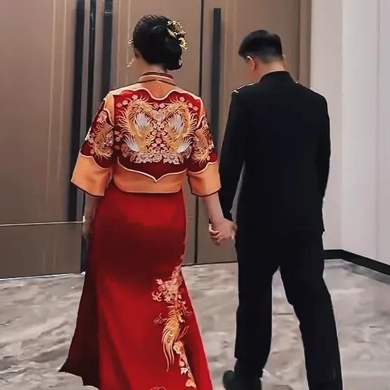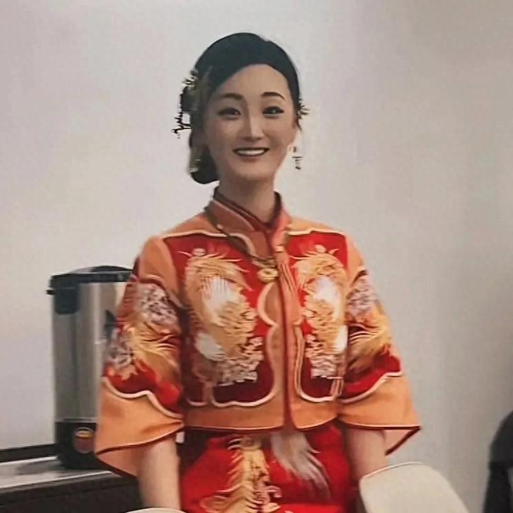 陈亚男身着中式秀禾服,笑靥如花,比当年结婚时可是要开心很多。