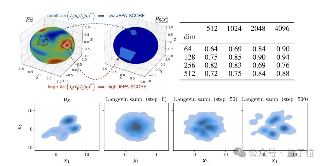 从理论层面看,当JEPAs输出高斯嵌入(高维空间中近似均匀分布于超球面的特征)时,模型必须通过雅可比矩阵(反映模型对样本微小变化的响应程度)感知数据密度,才能满足训练时的约束条件,这意味着学习数据密度并不是偶然,而是JEPAs训练过程中的必然结果。