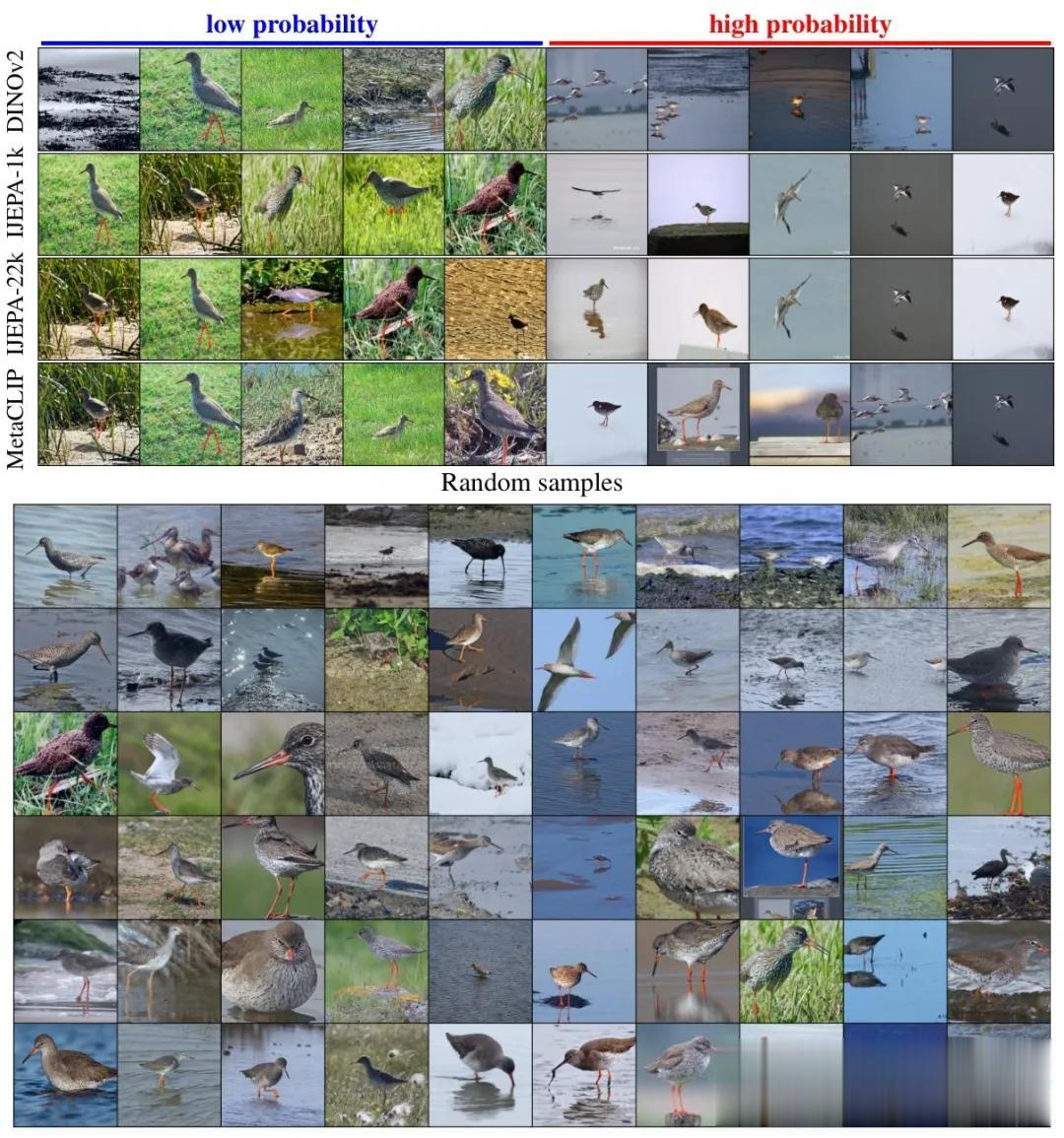 在ImageNet数据集中,不同JEPAs模型对典型样本(如飞行姿态的鸟类)和罕见样本(如栖息姿态的鸟类)的JEPA-SCORE判定高度重合,证明这是JEPAs的共性能力,并不是某个模型的偶然;