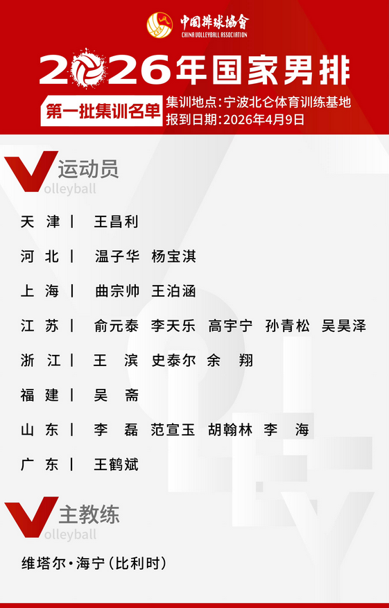 北京时间4月8日,中国排协官方公布男排集训名单,备战2026世界男排联赛。俞元泰、温子华、王鹤斌等领衔阵容,本期集训名单总共19位选手,其中9人是首次进入成年国家队。此外,最新的排超MVP选手薛智鸿缺席。
