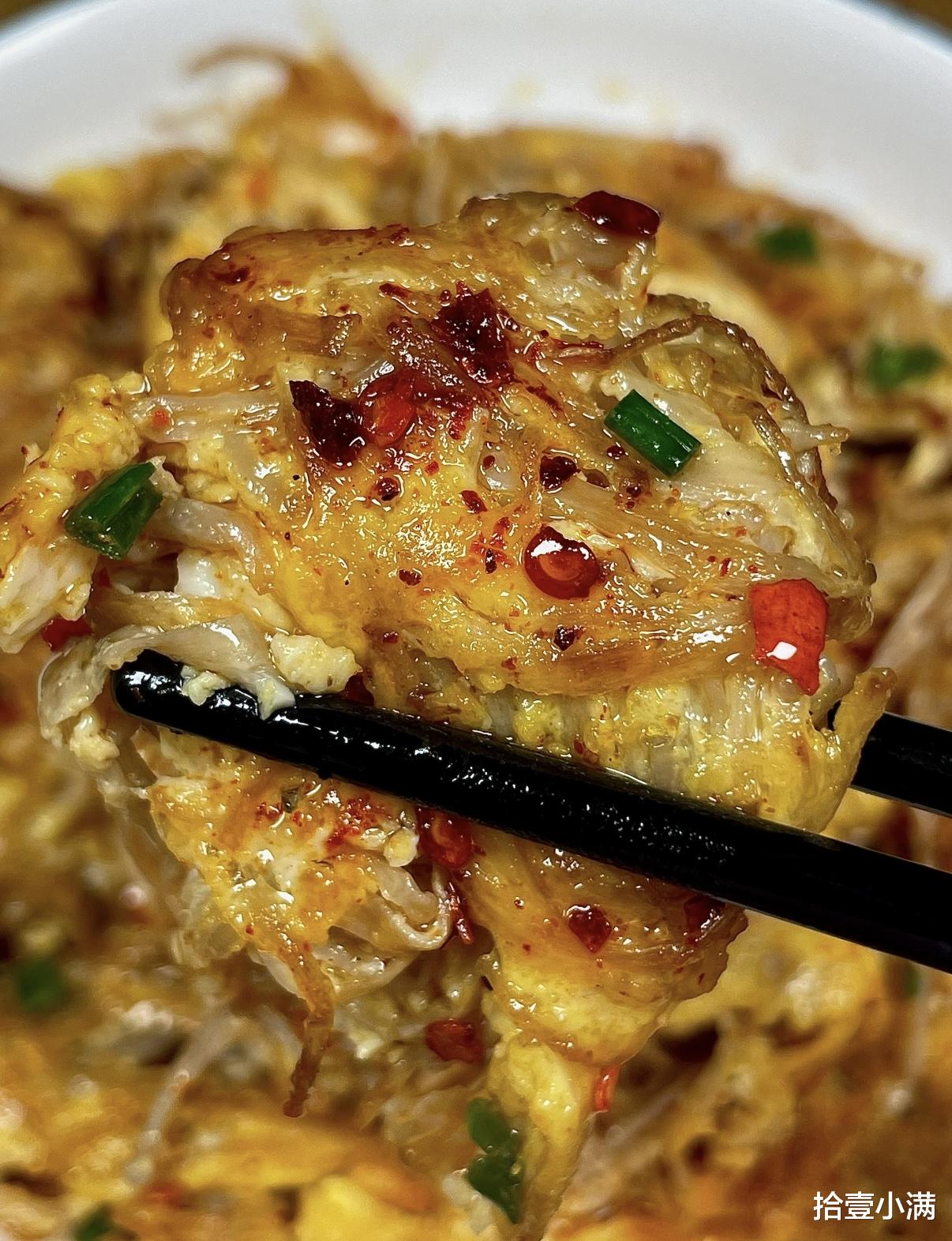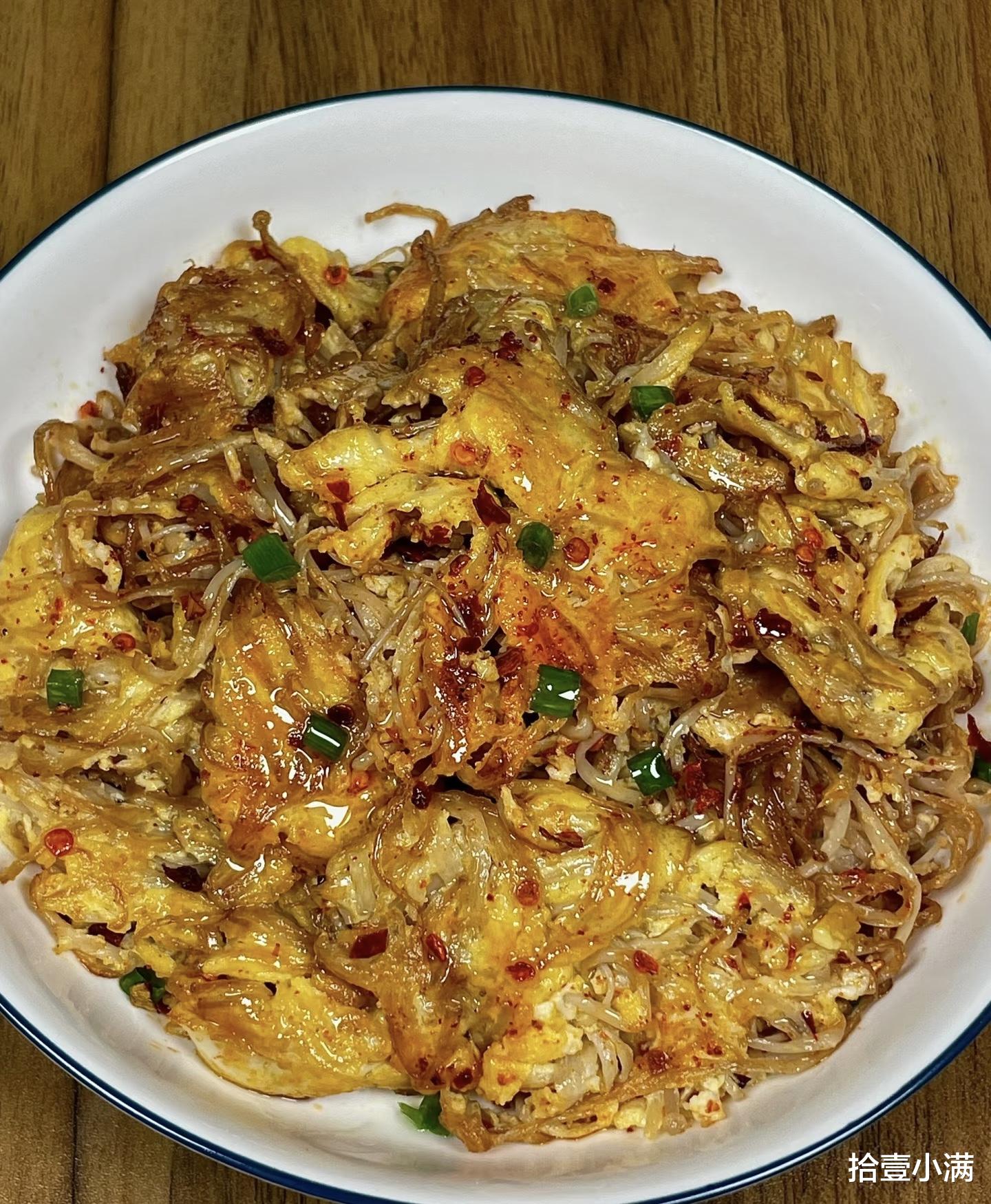 继续翻炒30秒,让金针菇和鸡蛋都裹上酱汁。最后撒上葱花,翻两下就关火,利用余温把香味激发出来。端上桌一看,金黄的鸡蛋裹着雪白的金针菇,闻着就香,一口下去,鸡蛋软嫩,金针菇脆滑,鲜味儿直钻舌尖,配米饭能吃两大碗!