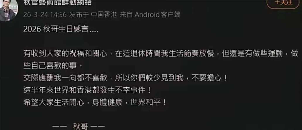 他坦言道,自己不喜欢交际应酬,加上经历至亲离去,对我打击很大,慢慢的偏爱独处,所以很少在公共场合露面,让大家别担心了,字里行间透露出他,比起热闹社交,他偏爱安静自在日子。